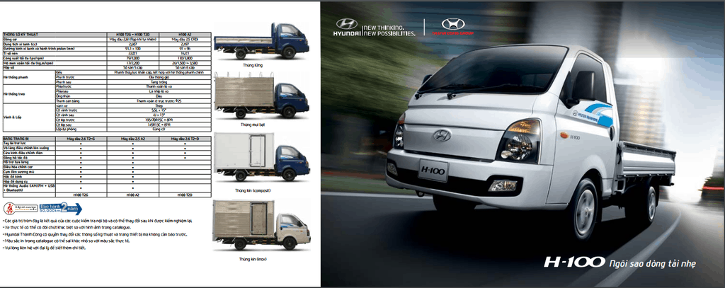 Hyundai H100 được Hyundai Thành Công phân phối với 4 phiên bản màu sắc: Trắng, Vàng, Xanh lam, Xanh lá với 3 phiên bản Cabin Chassis với giá khởi điểm từ 325 triệu đồng. Xe được bảo hành 2 năm hoặc 50.000 km tuỳ theo chế độ nào đến trước.